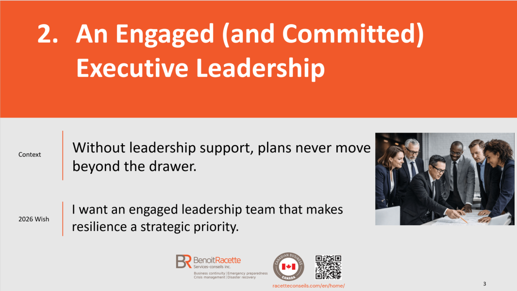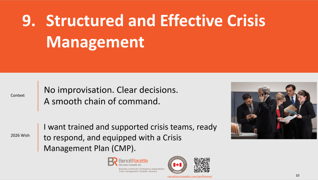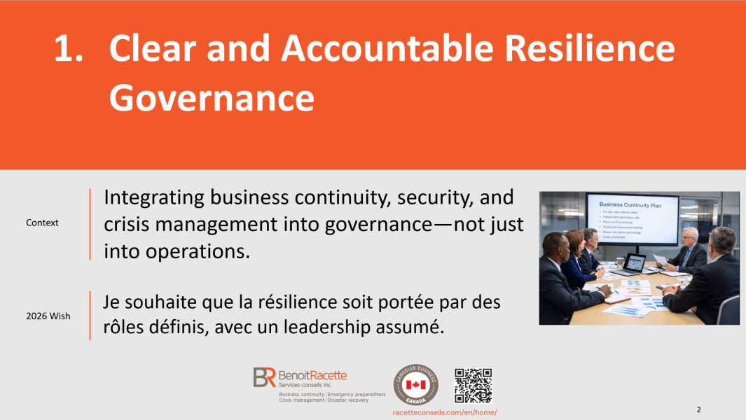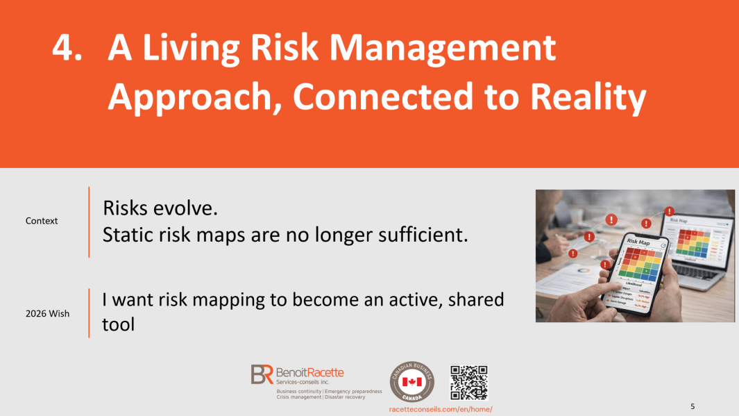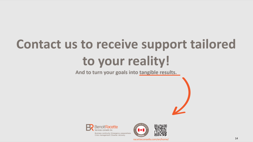 With more than 27 years of specialized experience in business continuity, crisis management, emergency preparedness and IT disaster recovery, Benoit Racette supports organizations with rigor and discretion, transforming complex challenges into practical solutions tailored to their reality.