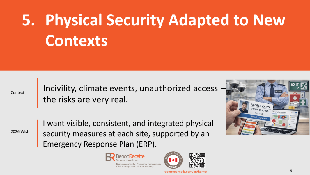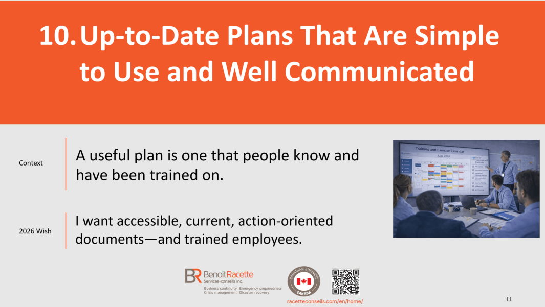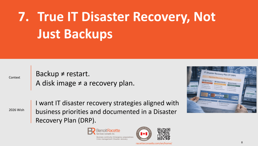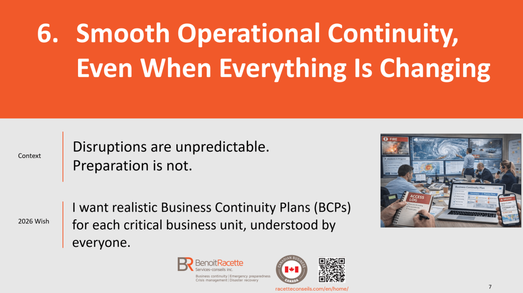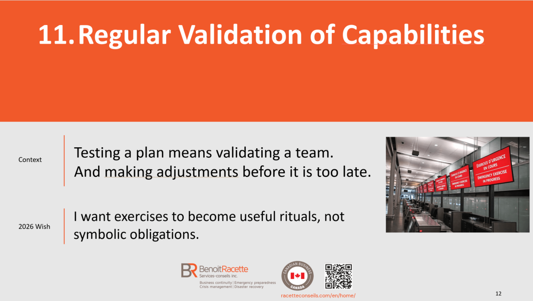 With more than 27 years of specialized experience in business continuity, crisis management, emergency preparedness and IT disaster recovery, Benoit Racette supports organizations with rigor and discretion, transforming complex challenges into practical solutions tailored to their reality.